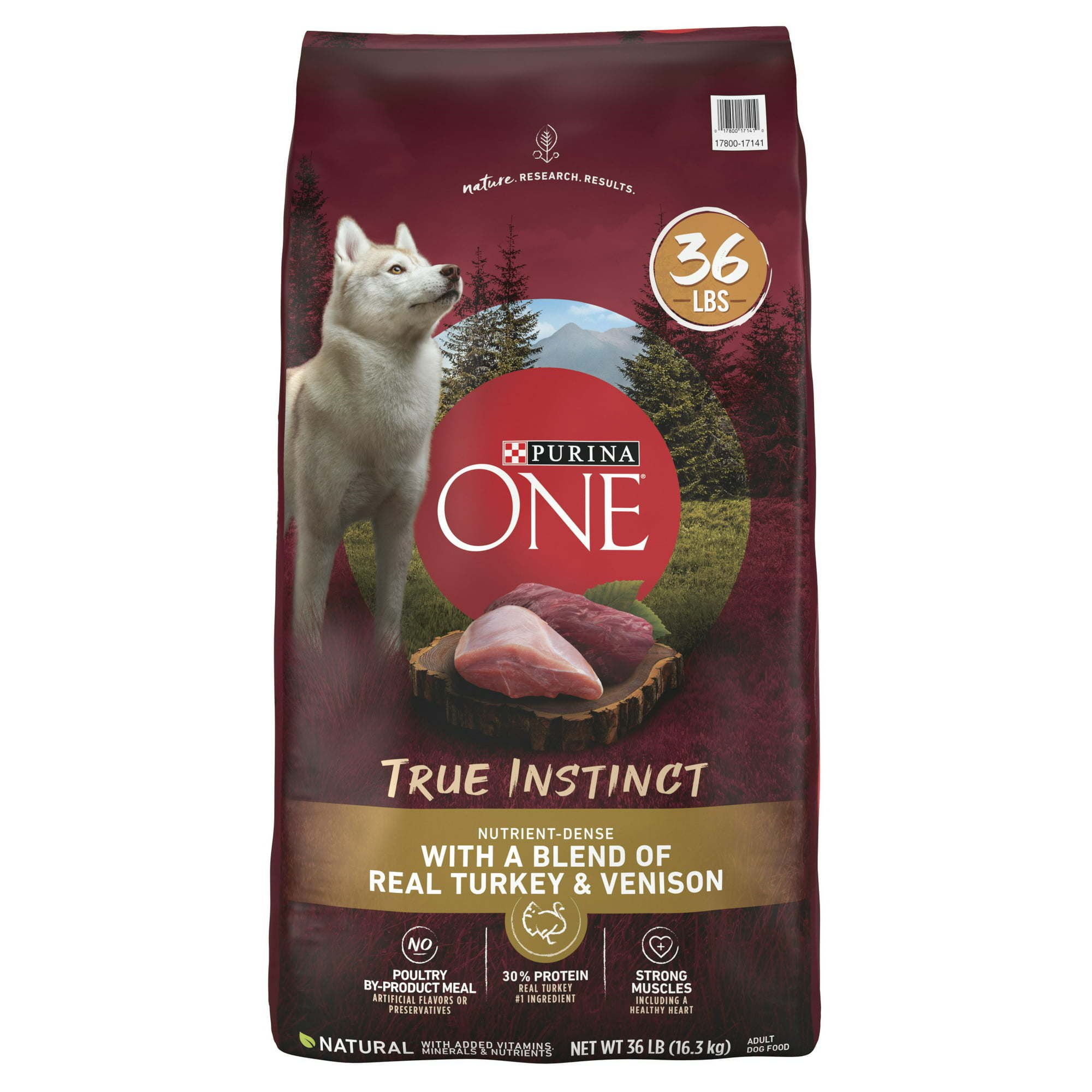Purina One True Instinct Turkey and Venison, Be sure your dog gets the nutrition he craves when you serve him Purina ONE True Instinct With a Blend Of Real Turkey Venison adult natural dry dog food with added vitamins, minerals and nutrients. With 100 percent nutrition and 0 percent fillers, every ingredient in this wholesome dog food has a purpose. We start our high protein dog food recipe with real turkey as the #1 ingredient and include real venison to help deliver 30 percent protein, which helps support your active dog's strong muscles, including his healthy heart.