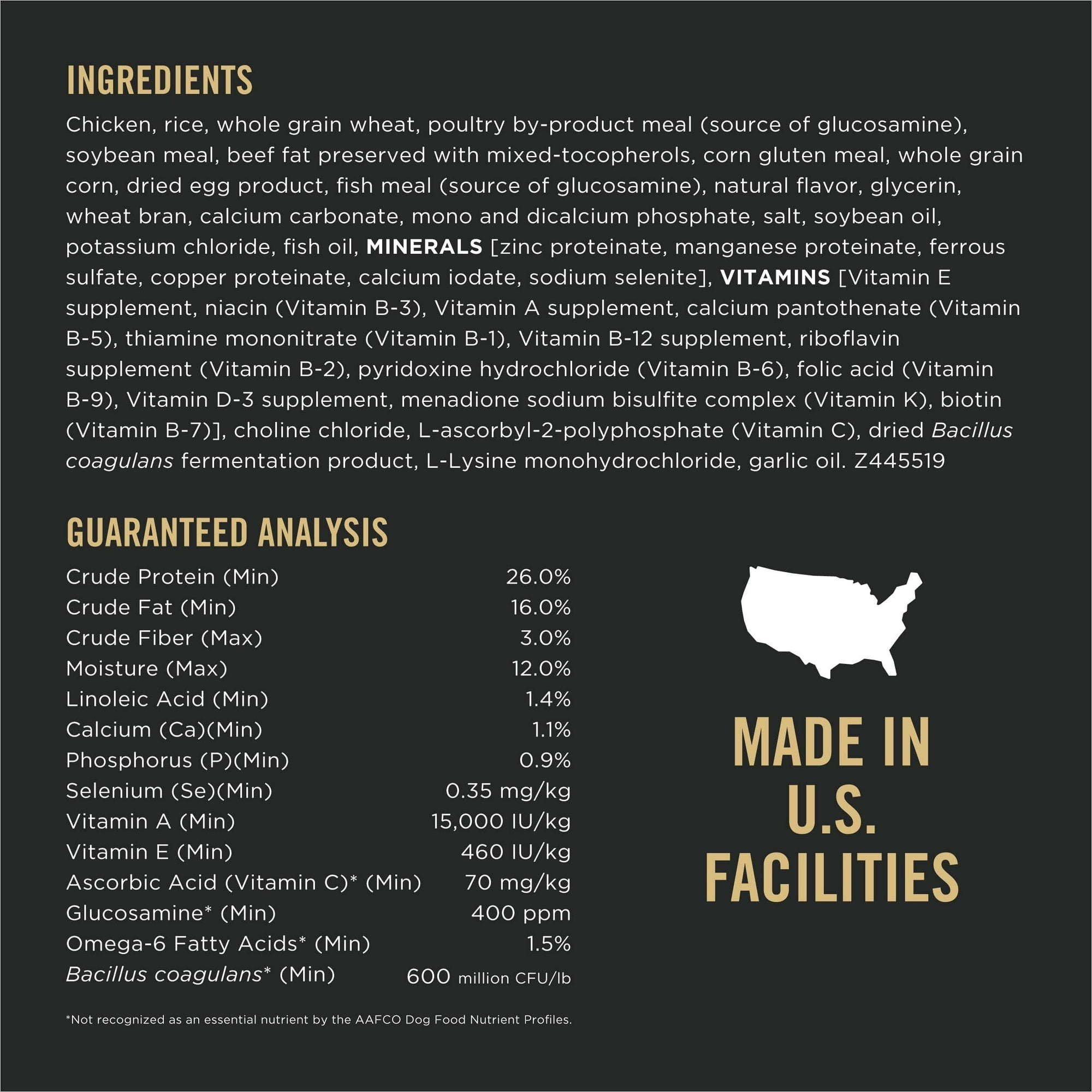Purina Pro Plan Complete Essentials for Adult Dogs Chicken Rice, Make your older dog's nutritional needs a top priority with Purina Pro Plan SENIOR Shredded Blend Chicken Rice Formula Adult 7+ dry dog food. Featuring real chicken as the #1 ingredient, this immune system support Purina dog food formula delivers the outstanding nutrition your senior dog needs to maintain his healthy body. Our delicious chicken and rice dog kibble is tasty and nutritious, creating a wholesome meal that satisfies you both. Watch him come running for the crunchy kibble combined with tender shredded pieces designed to make dogs clean their bowl.